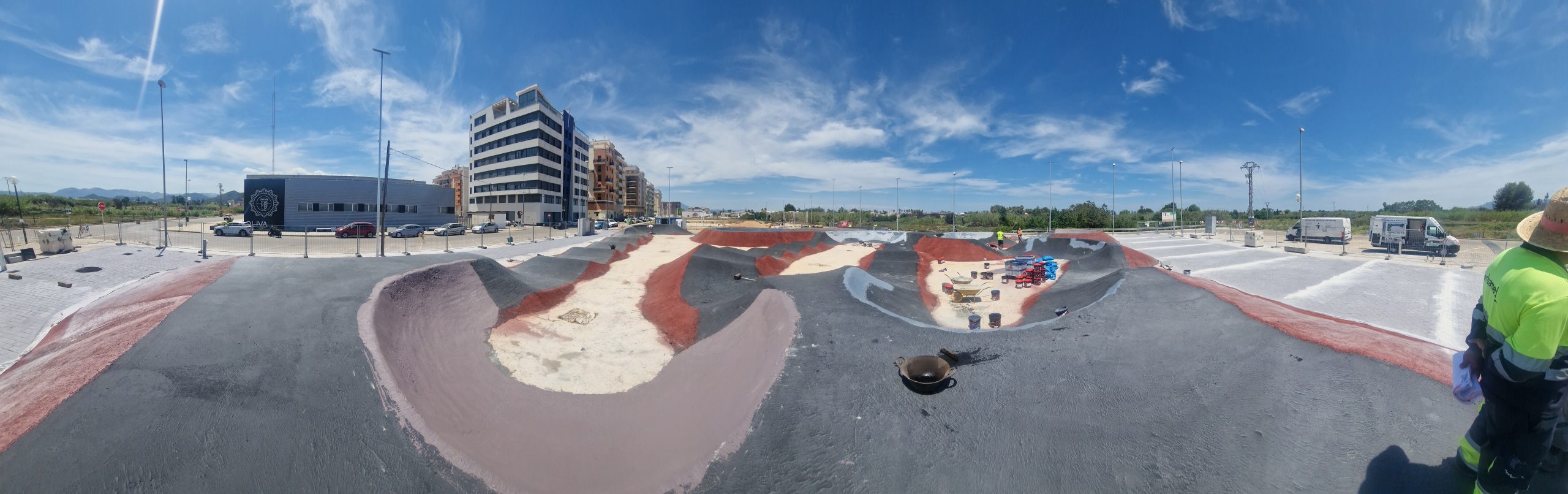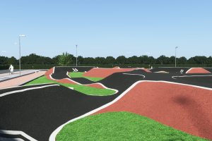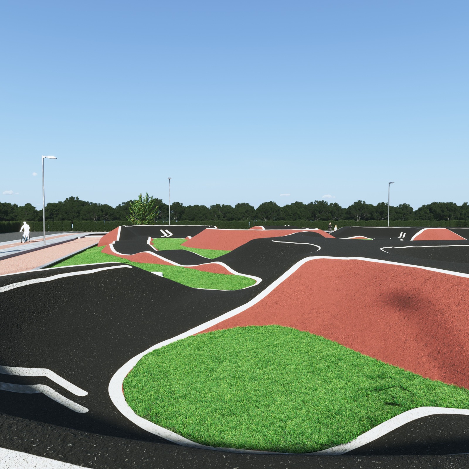 En el parque se encuentra una zona delimitada mediante rigola de hormigón, en la que se sitúa un Pump track formado mediante pavimento de mezcla bituminosa con acabado mediante dos capas de slurry sintético.
