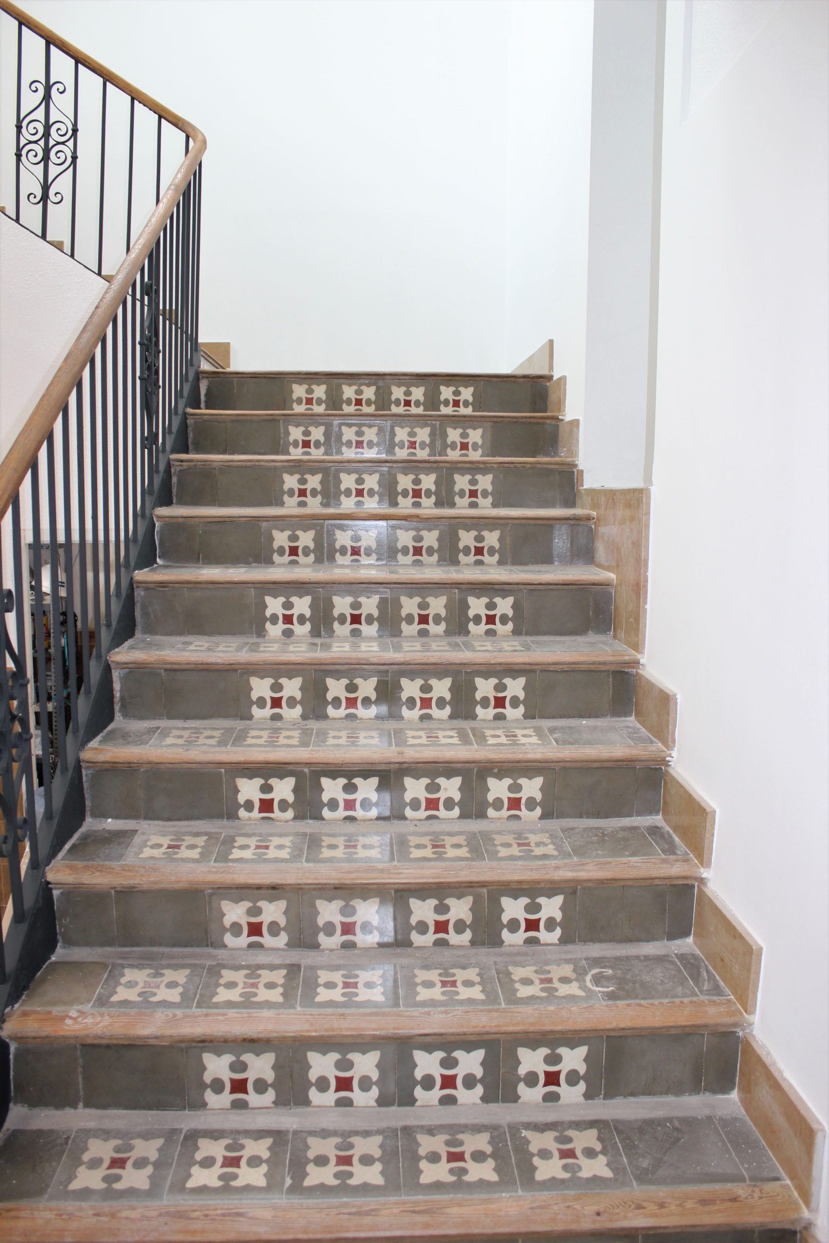 • Se han ejecutado trabajos de recuperación del pavimento hidráulico existente del edificio, para su posterior colocación como alfombras entre encintado de pavimento de mármol Ulldecona. En la zona de acceso y baños se utiliza la piedra Ulldecona para separación de estancias y como aplacado de paredes, así como de pavimento.