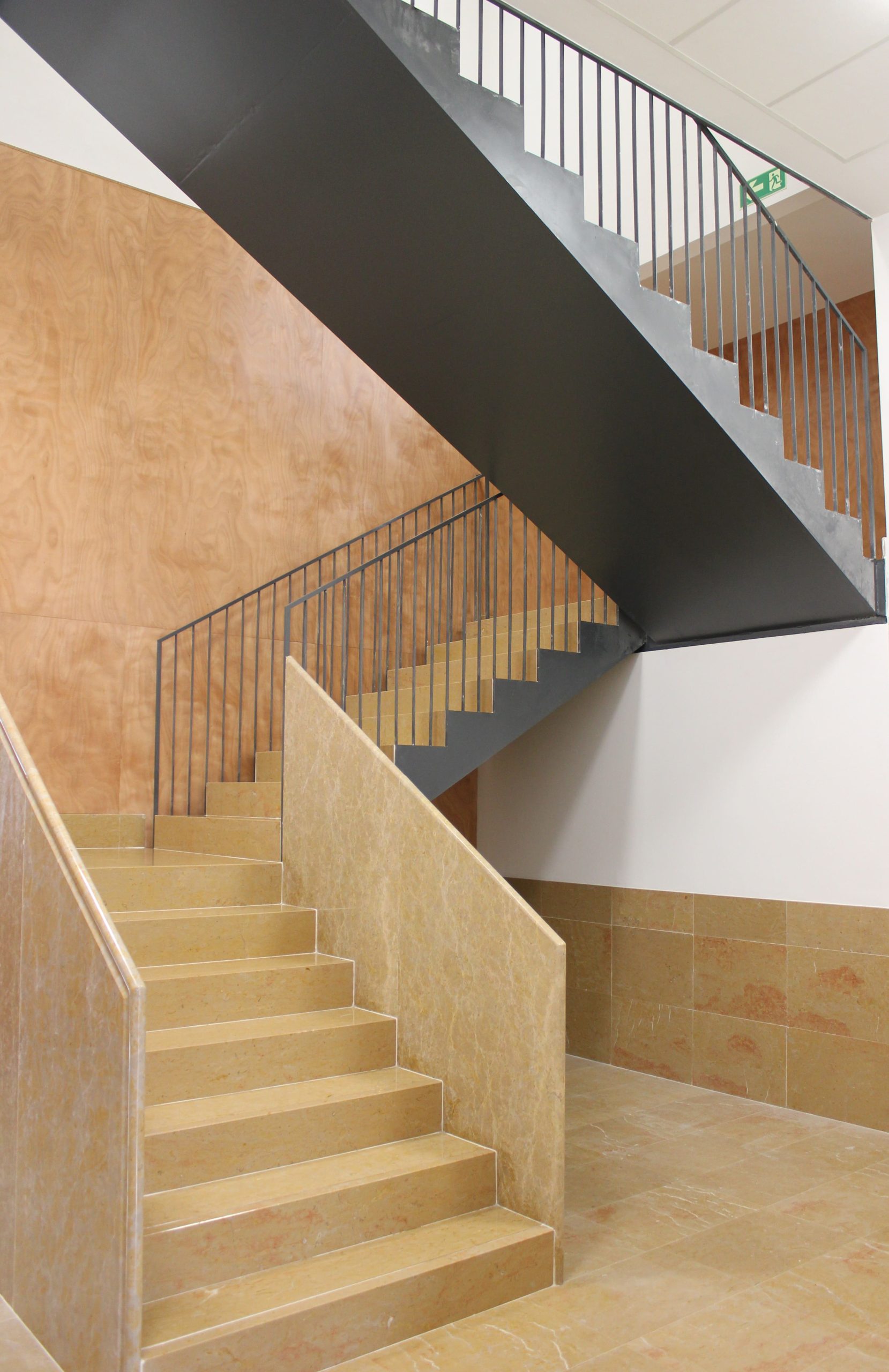 • En el interior existen varios tipos de acabados, desde el aplacado de piedra de mármol Ulldecona, tanto en zonas comunes, baños, como en la escalera principal de acero, así como el revestimiento de paramentos verticales con madera de okume y estanterías, el trasdosado de las fachadas con aislamiento en su interior y el falso techo fonoabsorbente rockfon ekla de grandes dimensiones.
